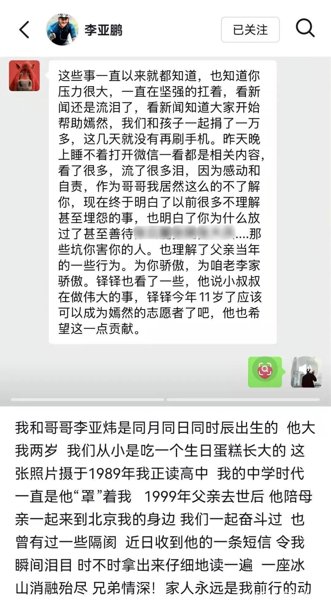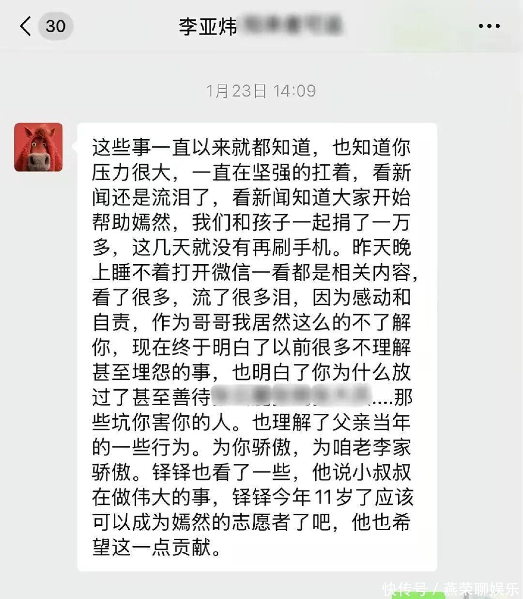 “这些事一直以来就都知道,也知道你压力很大,一直在坚强的扛着……看新闻还是流泪了……我们和孩子一起捐了一万多……作为哥哥我居然这么的不了解你,现在终于明白了以前很多不理解甚至埋怨的事……为你骄傲,为咱老李家骄傲。